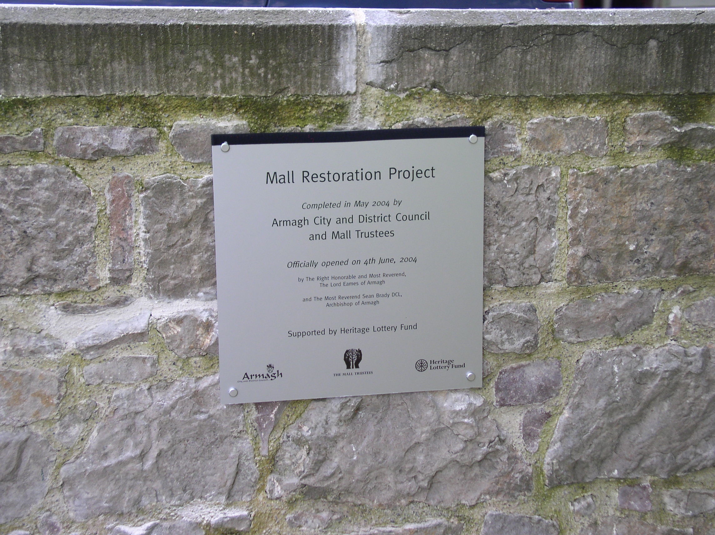 Archbishop Robin Eames and Archbishop Seán Brady officially reopened The Mall last year at a special function. The ceremony was the culmination of a £1.3m Mall restoration scheme which was funded by the Heritage Lottery Fund and Armagh City and District Council. The architectural significance and historical importance of the Mall is coupled with the fact that it is the first Urban Park Scheme to be completed in Northern Ireland, funded by the Heritage Lottery Fund.